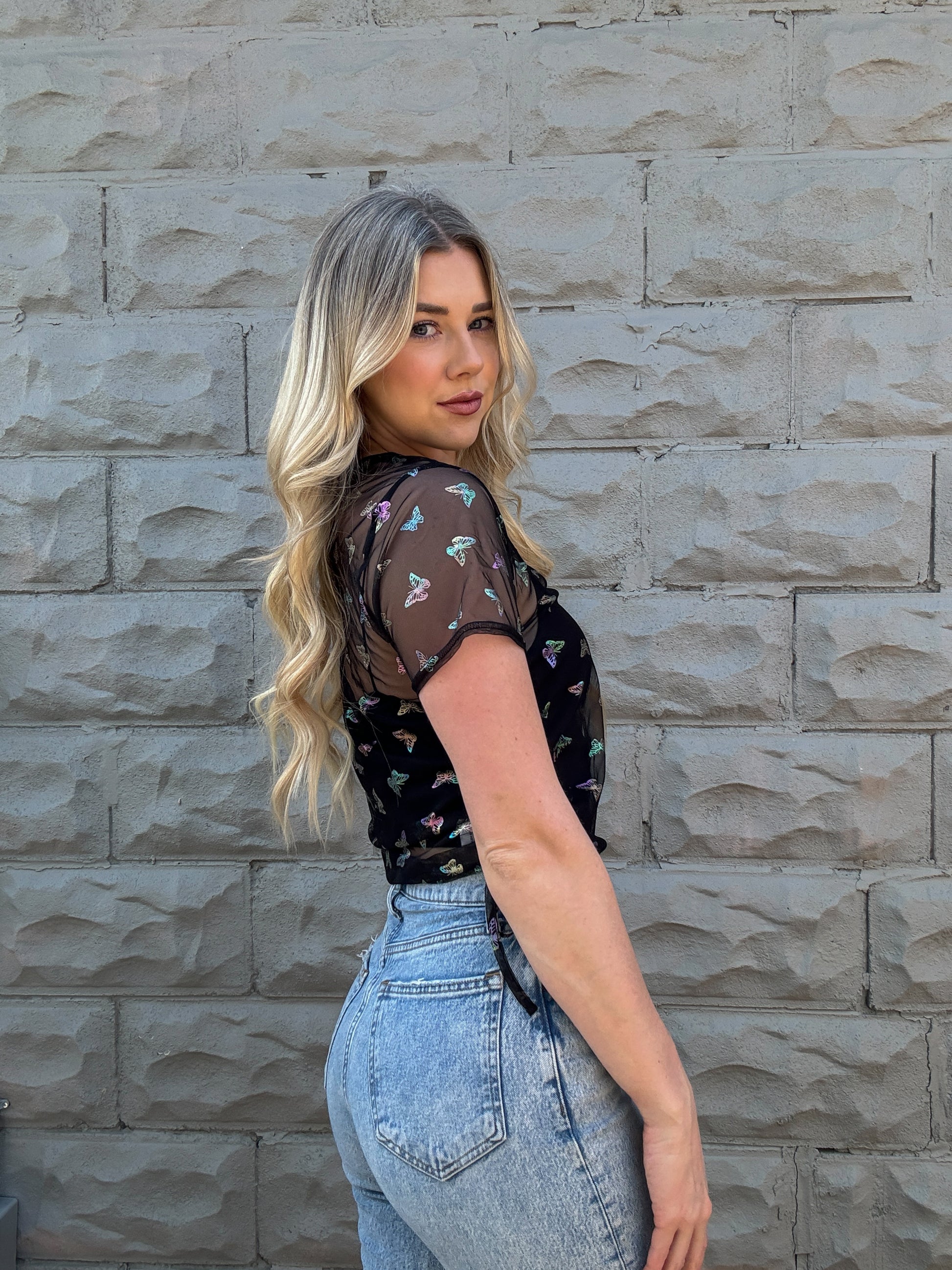 Sheer black top with rainbow holographic butterfly design and adjustable side ties.